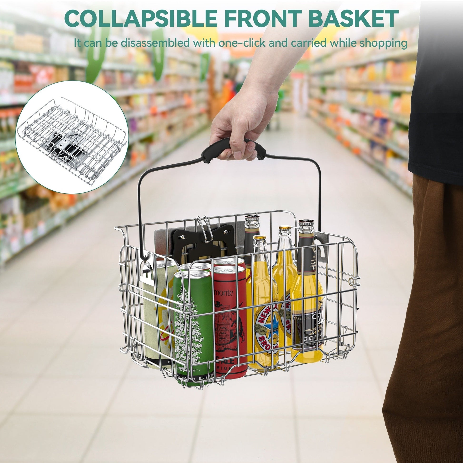 - The front basket is foldable and detachable, and you can carry it for shopping with one button disassembly