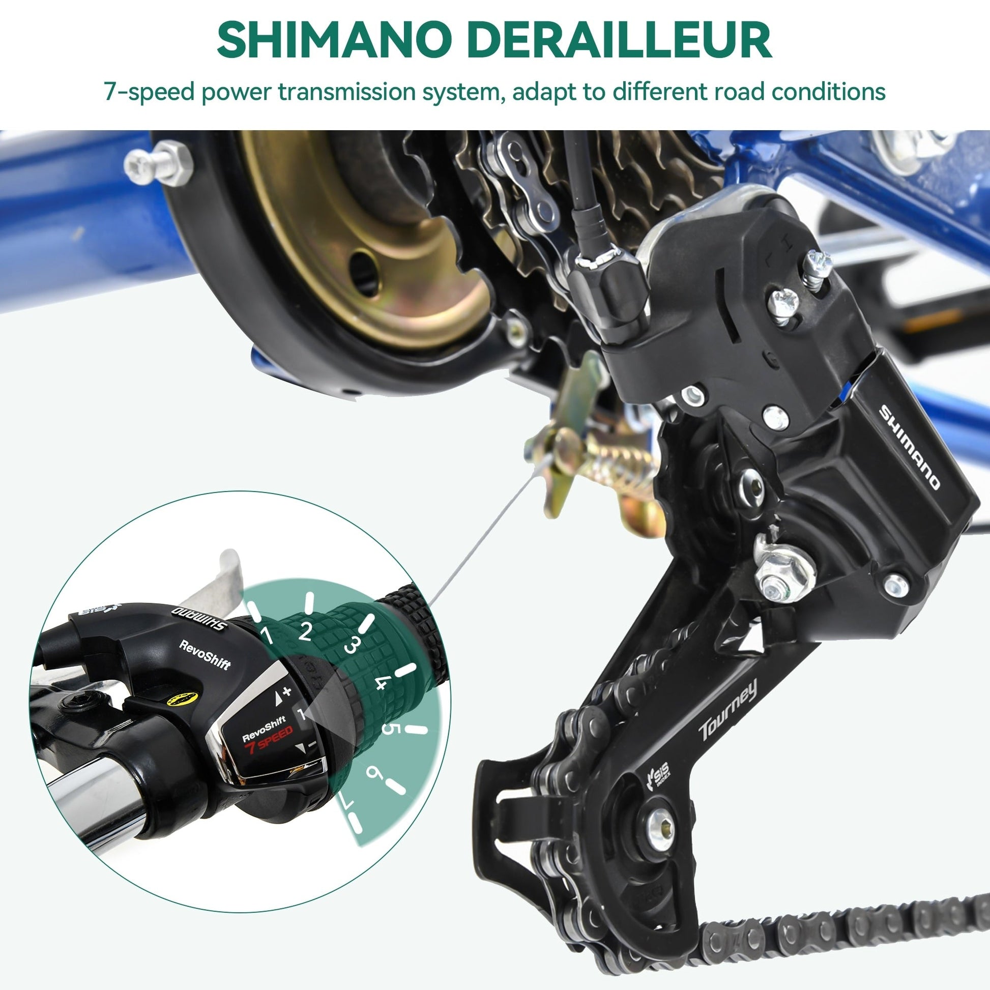 - Equipped with Shimano gear shifting, there are 7 speeds according to different road conditions