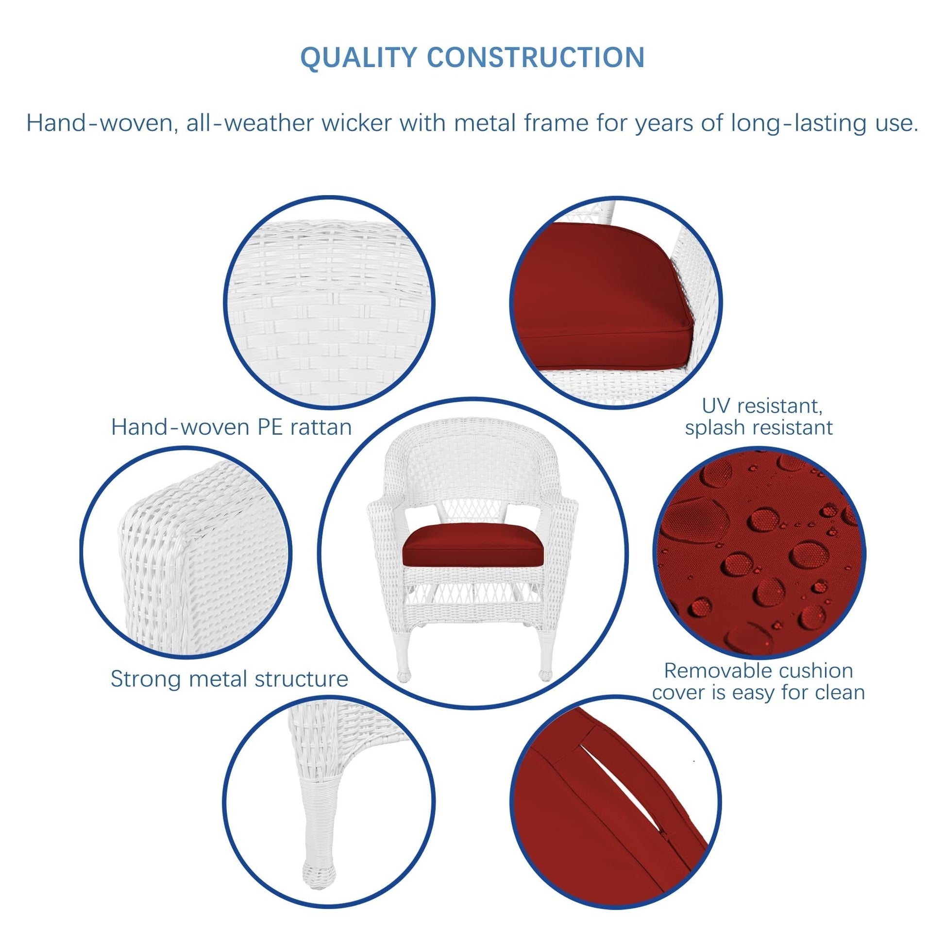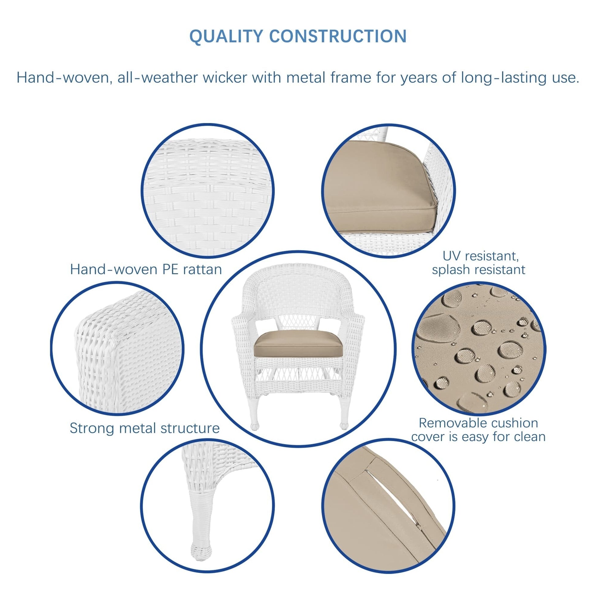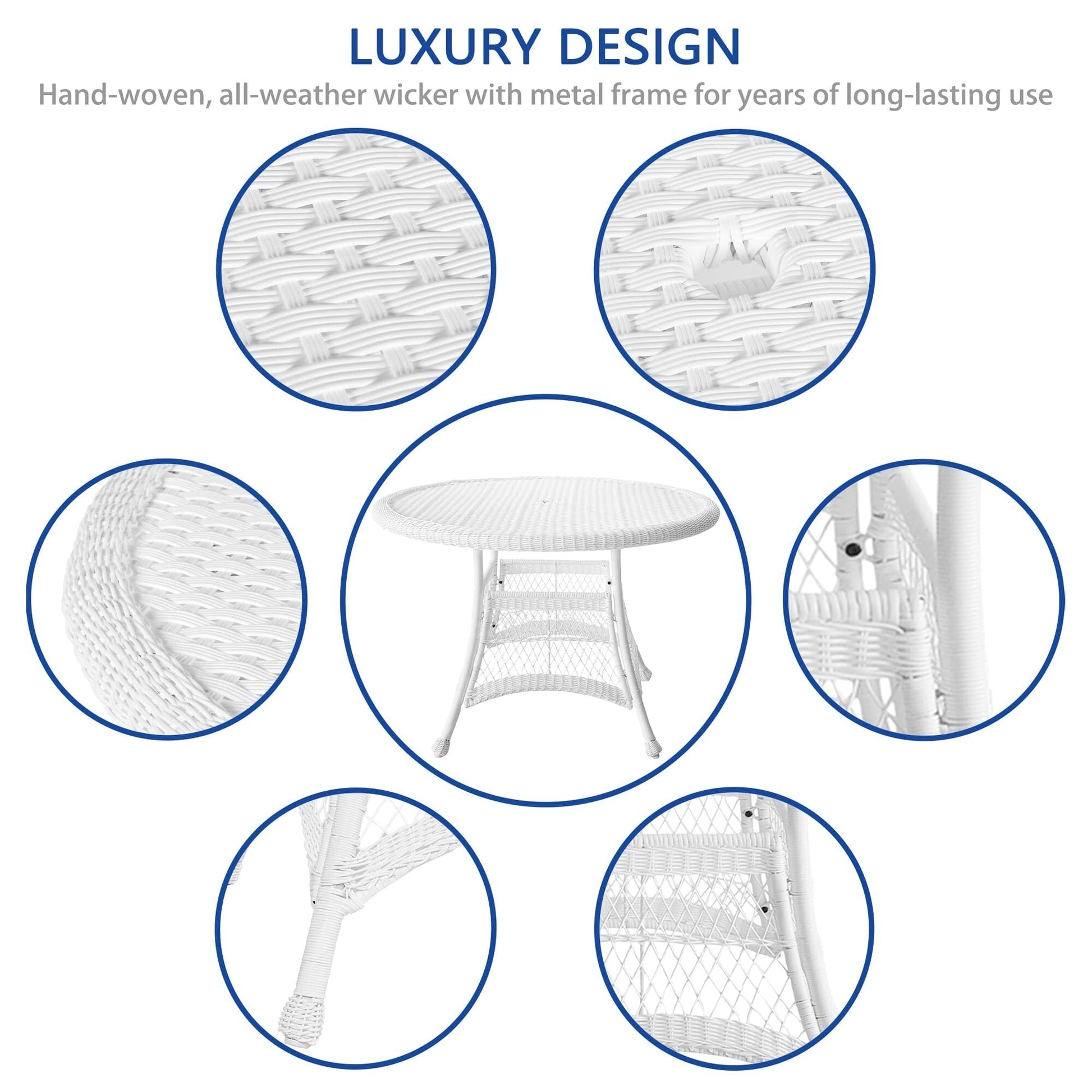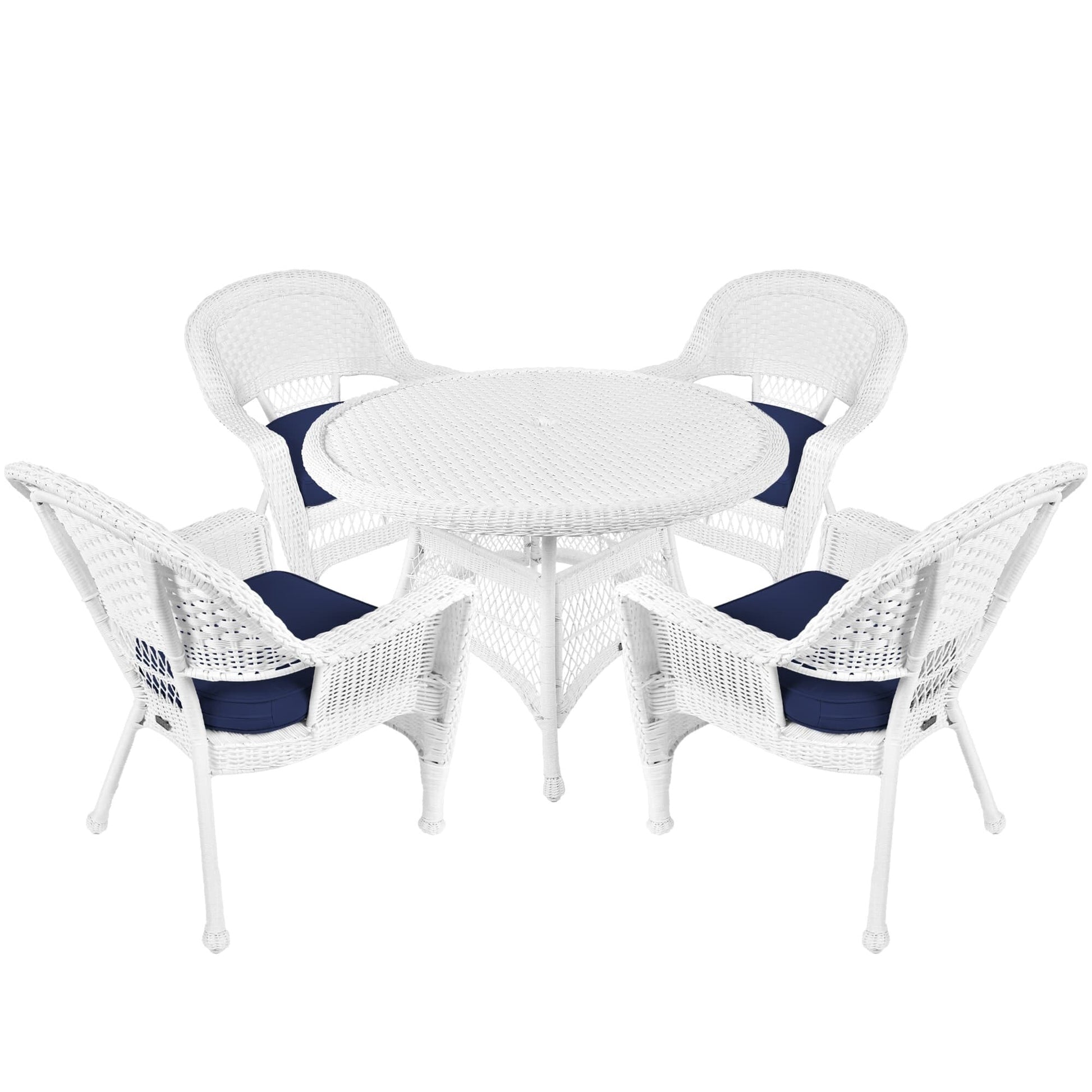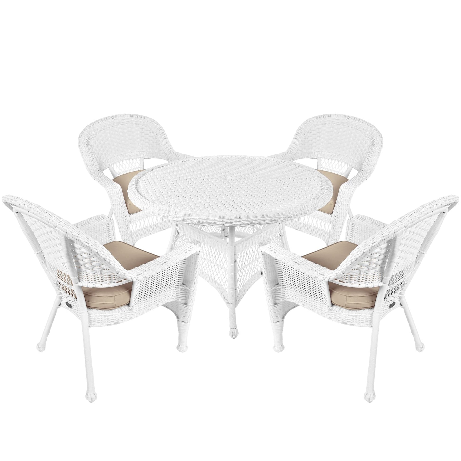Make your outdoor space more comfortable with this 5-piece White Resin Wicker Dining Set. Enjoy the comfort of indoor living with this stylish wicker set, which comes with a round wicker table and four chairs with plush cushions available in various colors. The set is built to last with its steel frame and all-weather resin wicker.