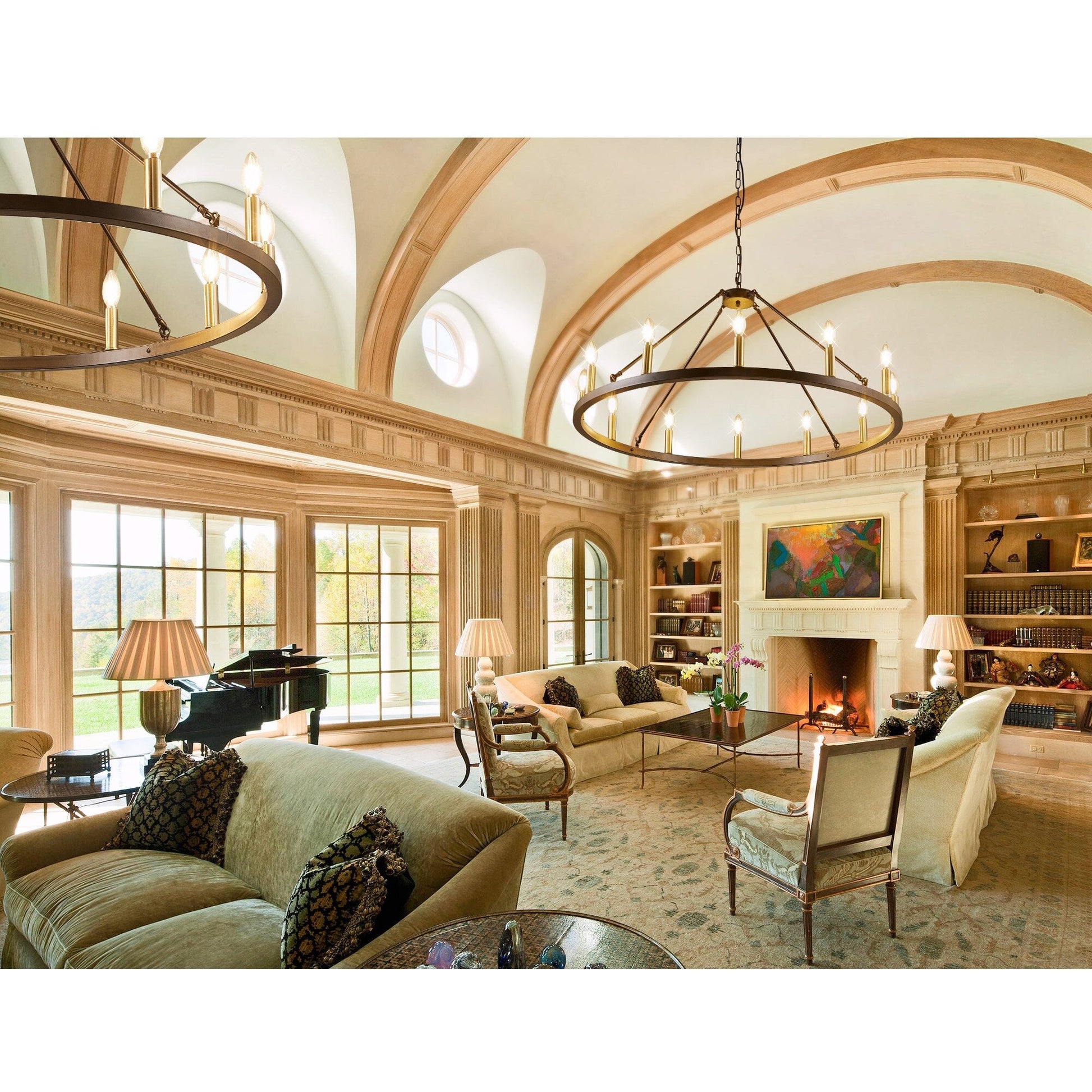 Add a touch of modern farmhouse style to your home 54-inch Round Wagon Wheel 24-light Chandelier. Made of sturdy metal and available in multiple finishes, this chandelier boasts a charming wagon wheel design that is sure to impress. With 24 bulbs and an ample size, this fixture provides plenty of light for larger rooms and is perfect for creating a cozy atmosphere in any space.
