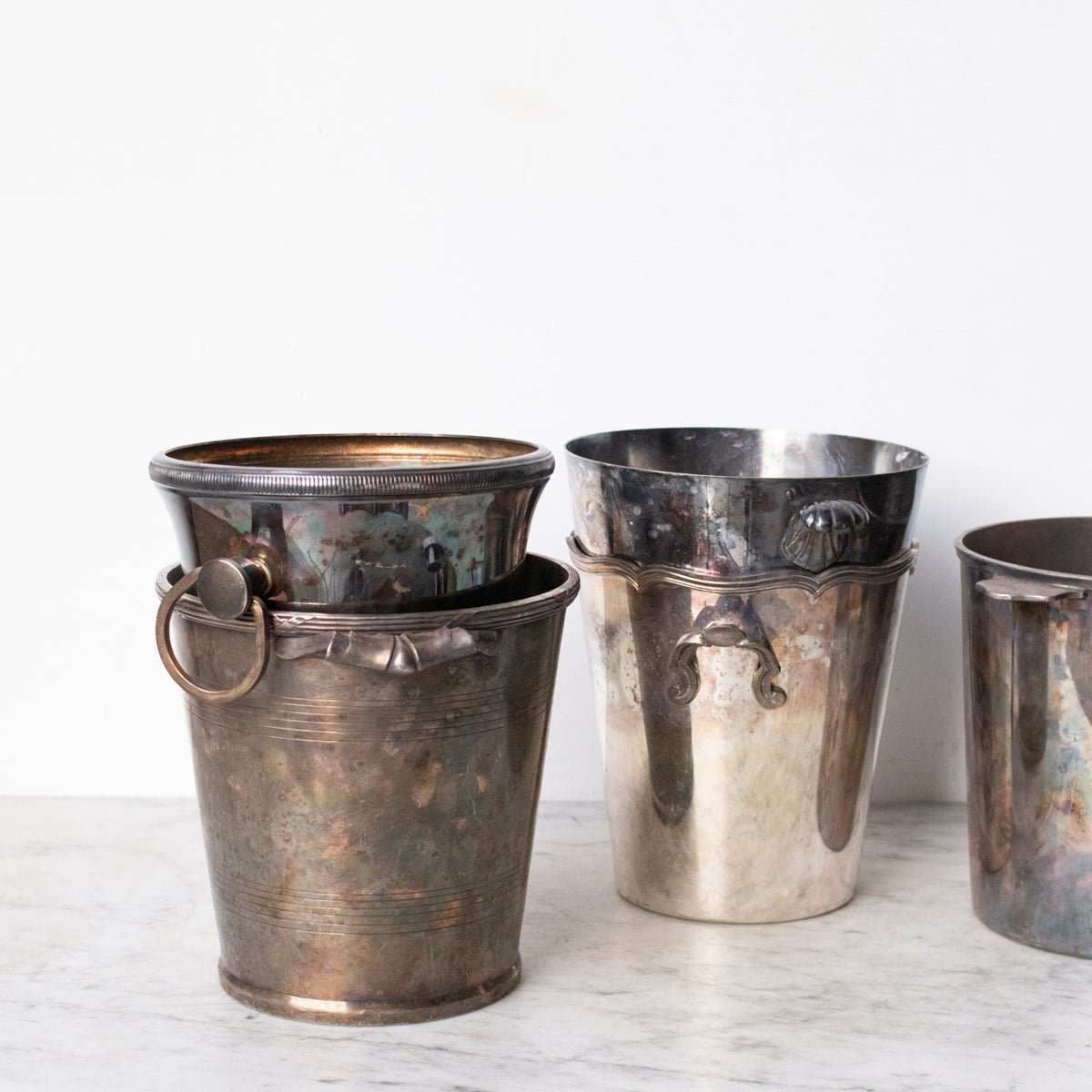 These champagne buckets were once used in French hotels. Now we think one is a pretty addition to your bar, or a lovely wedding gift. Silver plated.