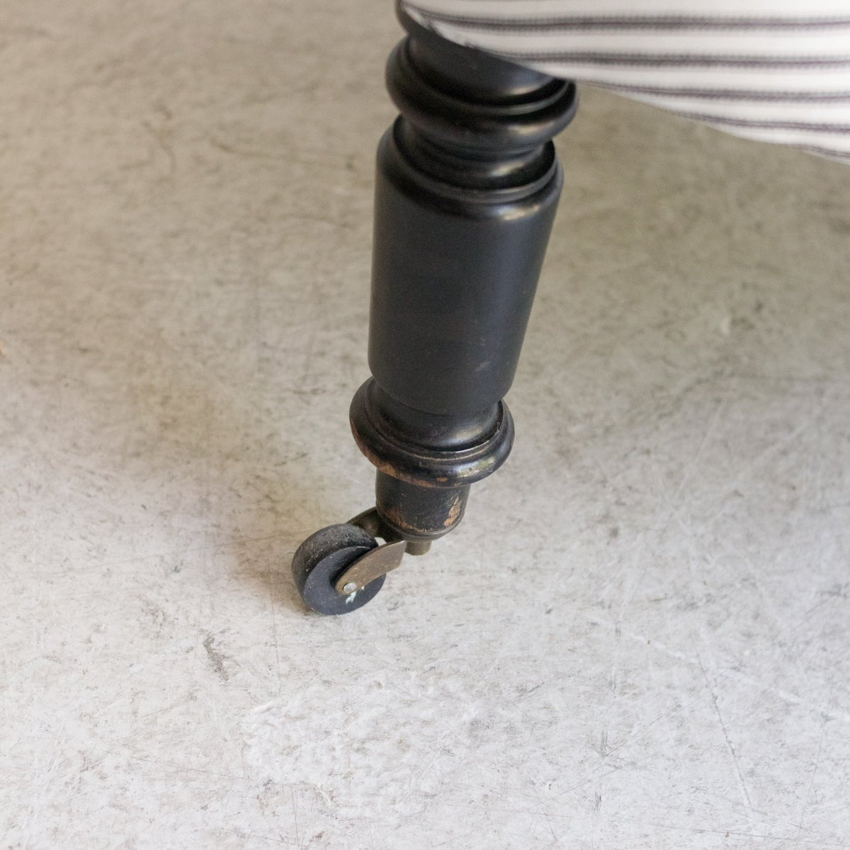 - Restored and re-covered in black and white yarned dyed cotton ticking stripe.