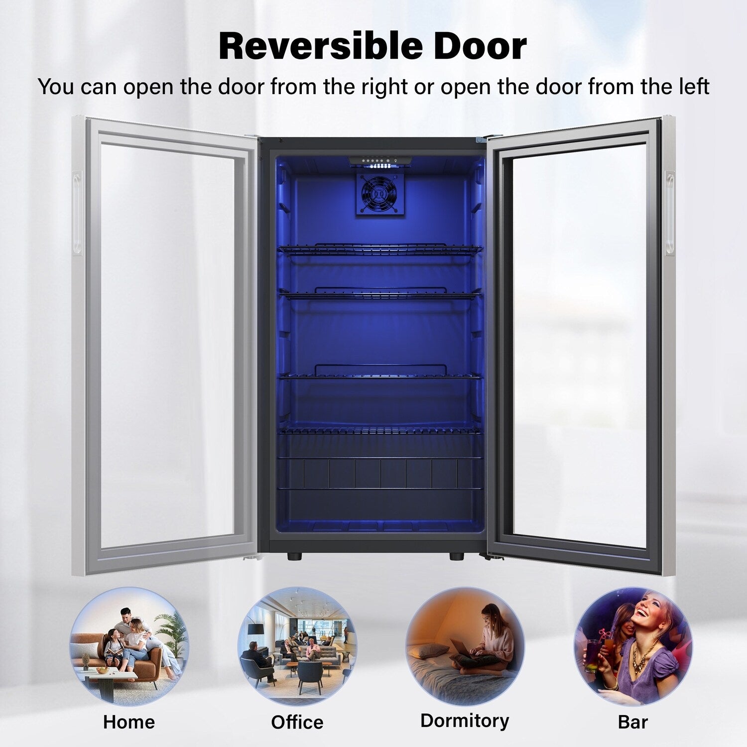• Spacious and Versatile Storage: With the capacity to hold up to 140 standard 12oz cans, this beverage cooler offers ample space for all your favorite drinks. Four removable shelves provide customizable storage options, making it easy to accommodate various bottle and can sizes, from energy drinks to larger bottles.